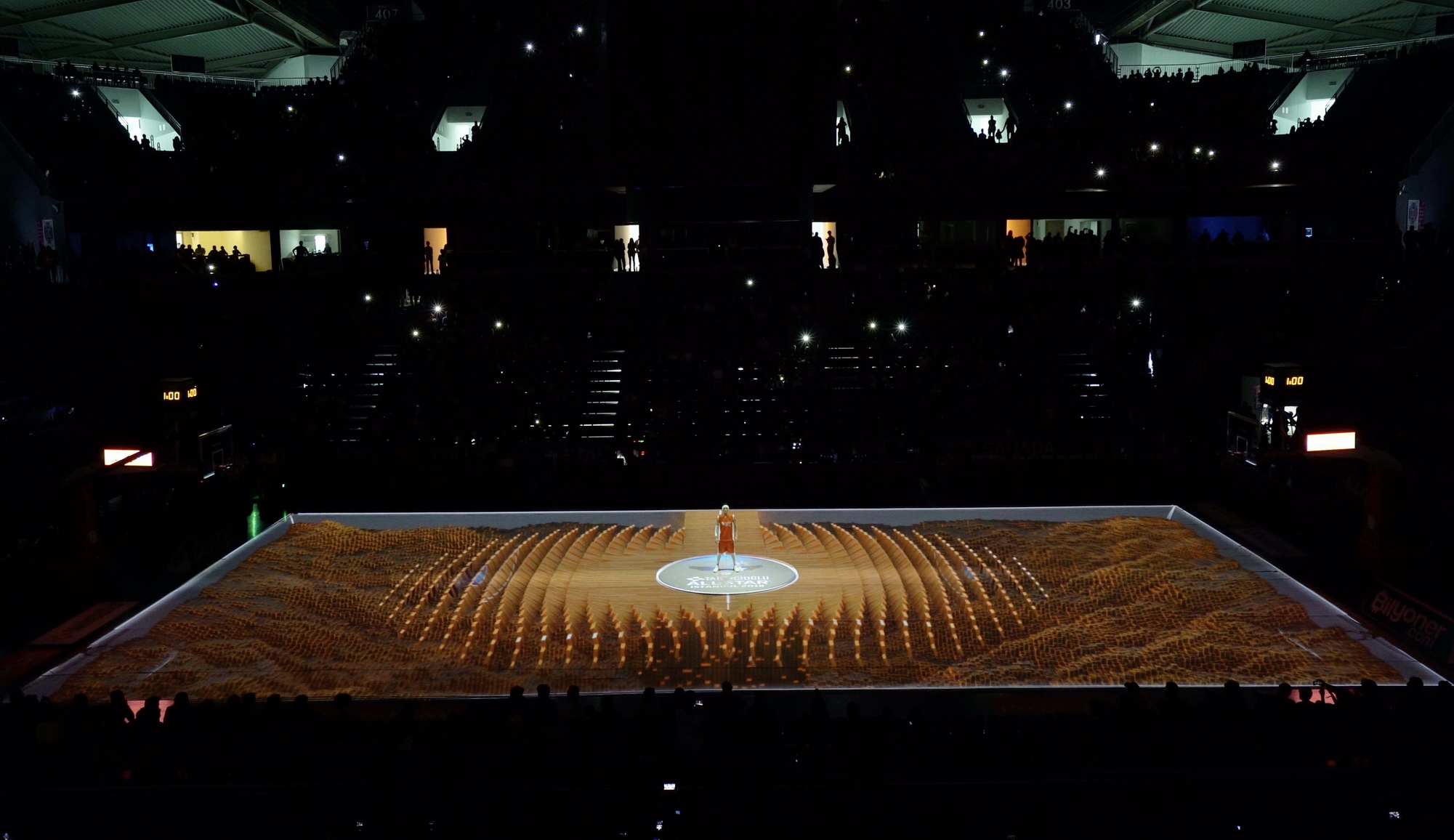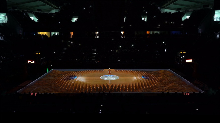 The story of the never-ending hype of basketball is narrated in a 3-minutes-long video mapping show through 100 kinetic balls accompanying the performer. By means of 3D mapping technology, the basketball court is used as a canvas so that the inspiring, dynamic, exciting energy of the game could surround the spectators!